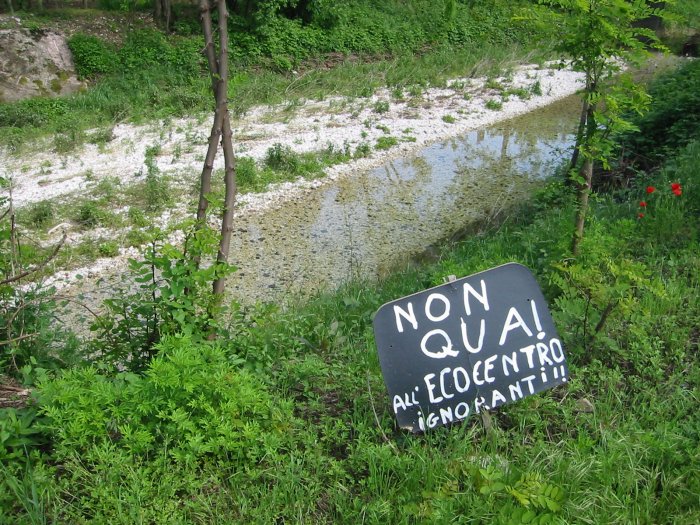 Ad un certo punto lungo il Grande Fiume c'è questo ponticello, da cui alcuni birbantoni ogni tanto sbadatamente buttavano della spazzatura direttamente in acqua. Gli abitanti si sono ribellati, con questo cartello!!! (dall'altra parte del ponte ce n'è un altro... la prossima foto: preparatevi: parolone grosse!) |