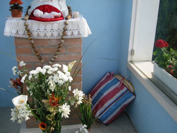 Nel capitello della Madonna Della Morte è stata abbandonato questo set di borse da viaggio. Subito si era pensato ad un attentato terroristico, ma poi le borse risultarono vuote. Così si pensò a delle soatanze allucinogene, ma c'erano già i fiori nel vaso (non mi dilungherò a descriverveli, ma sappiate che sono tutti fiori rozzampiesi! Non dico altro). Alla fine si scoprì che erano semplicemente le borse delle offerte del prete. Tornando per un attimo ai fiori: le vedete quelle specie di margherotine tutte bianche? Sono soltanto la varietà albina della rinomatissima... |